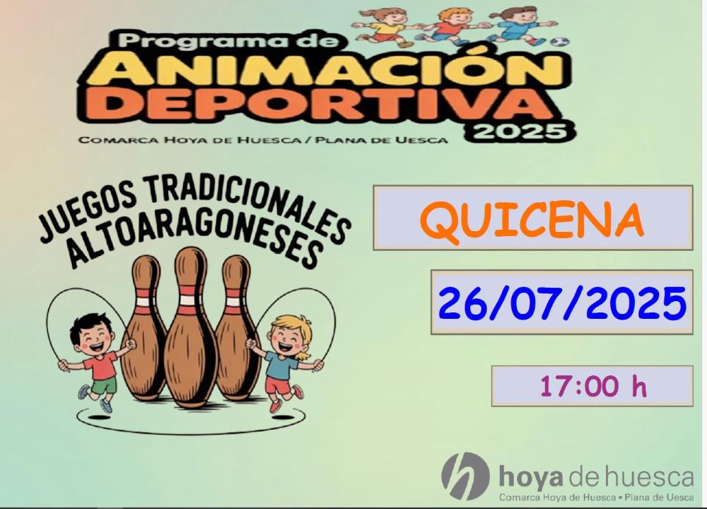 La Comarca Hoya de Huesca organiza la actividad programa de animación deportiva 2025 en Quicena; la actividad de juegos tradicionales con el Club Juegos Tradicionales altoaragon. Se realizará a las 17:00 el sábado día 26 de julio de 2025 en el parque Javier Tomeo.