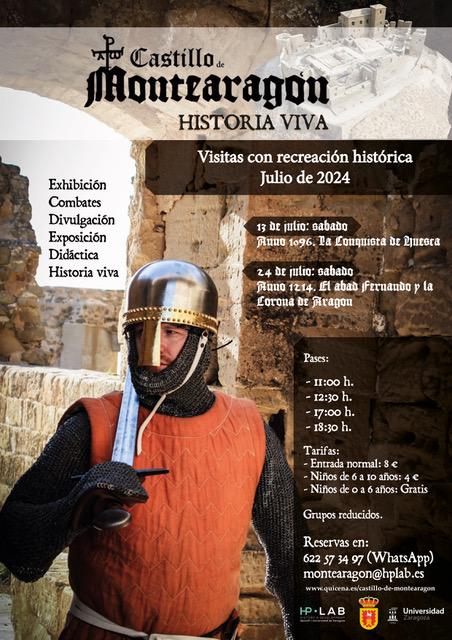 El Castillo de Montearagón ofrece un programa de visitas guiadas con recreación histórica. Durante estas visitas, los asistentes podrán sumergirse en la cultura material de la Edad Media. El evento incluye exhibiciones, combates, divulgación, exposiciones didácticas y una experiencia de historia viva. Las fechas para esta recreación son el 13 y 27 de julio, así como el 10, 15 y 24 de agosto.
